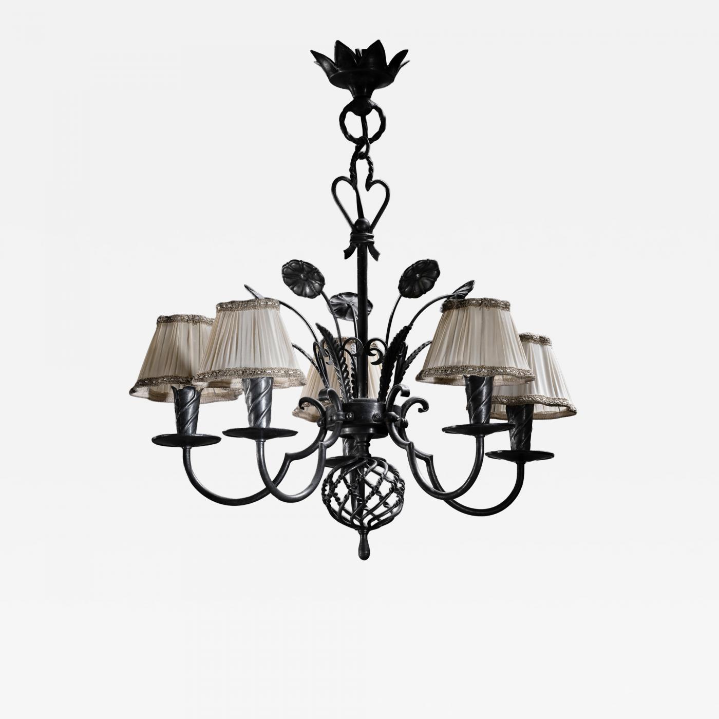 A five-armed model 206/5 chandelier by Taidetakomo Hakkarainen, featuring a wrought iron structure with floral decorations, and trimmed fabric shades. Documentation present.