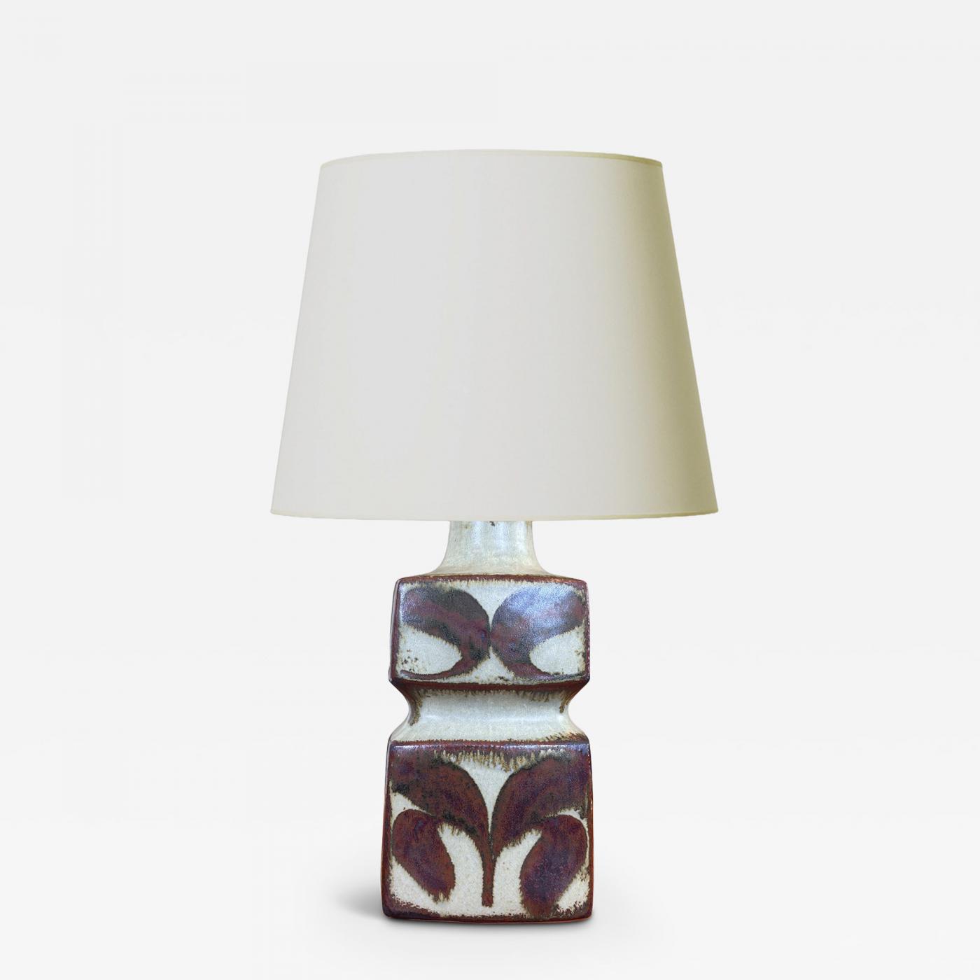 Nordic Modern table lamp by Ursula Printz Mogensen (1920-1993), having a tiered squared form, glazed in a pale warm gray with foliate motifs in rust luster; stoneware; Denmark, 1960s; painted “Ursula F161”