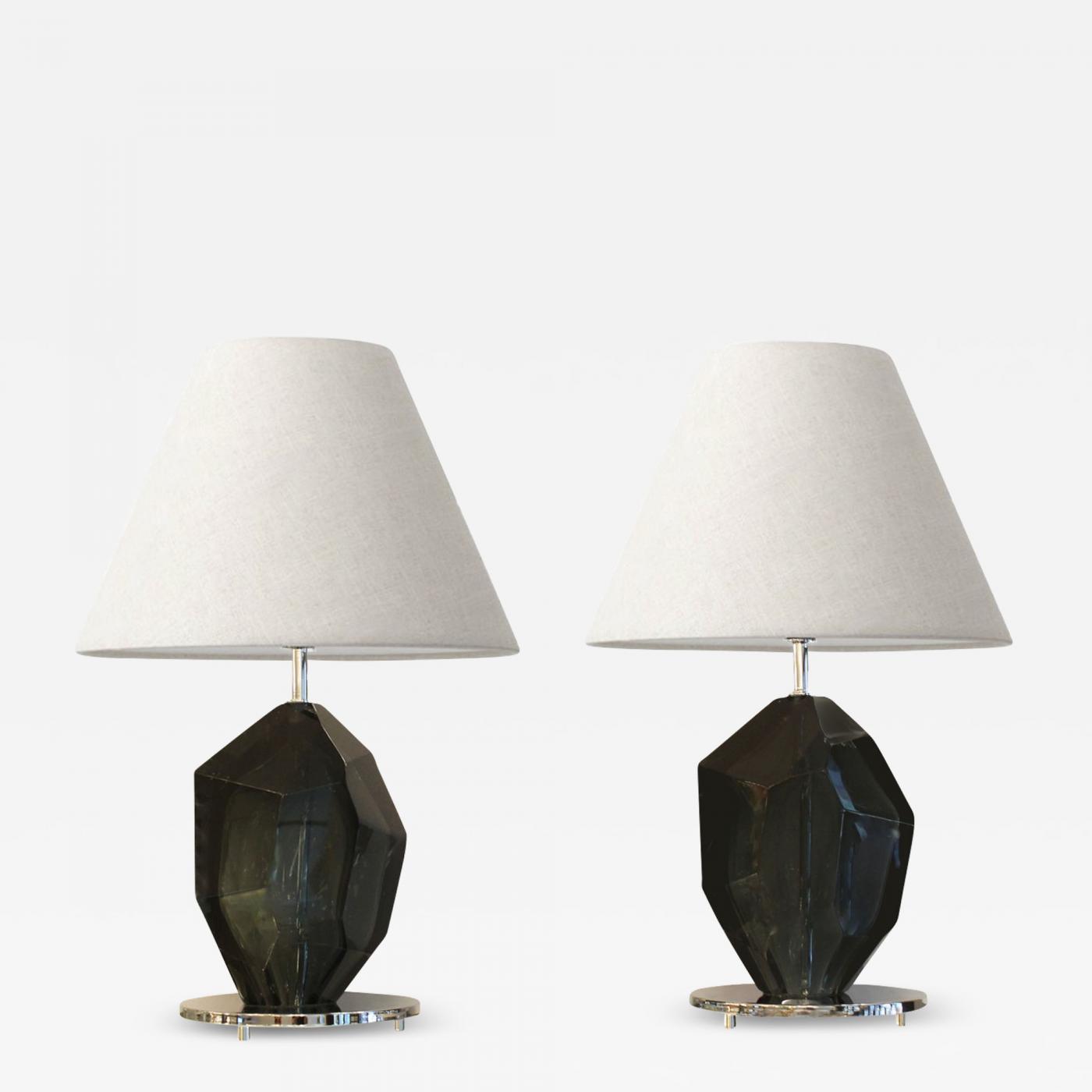 Pair of Murano dark gray glass gem cut table lamps with chrome hardware and base. Italy 2021.
