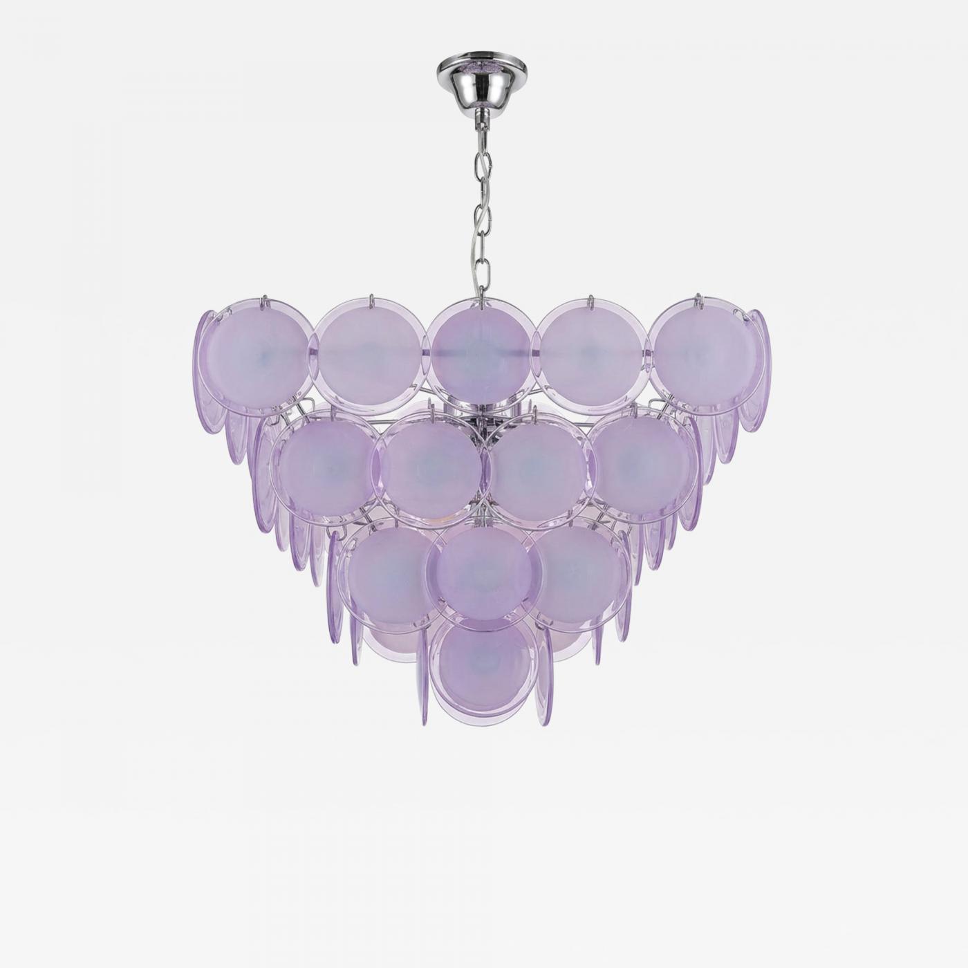 Stunning mid-century Murano glass disc chandelier. Suspended from a polished chrome canopy and chain, the fixture is composed of 52 discs arranged in 4 layered rows. Each of the circular discs is hand-blown and comes in a soft, luminous lavender hue.