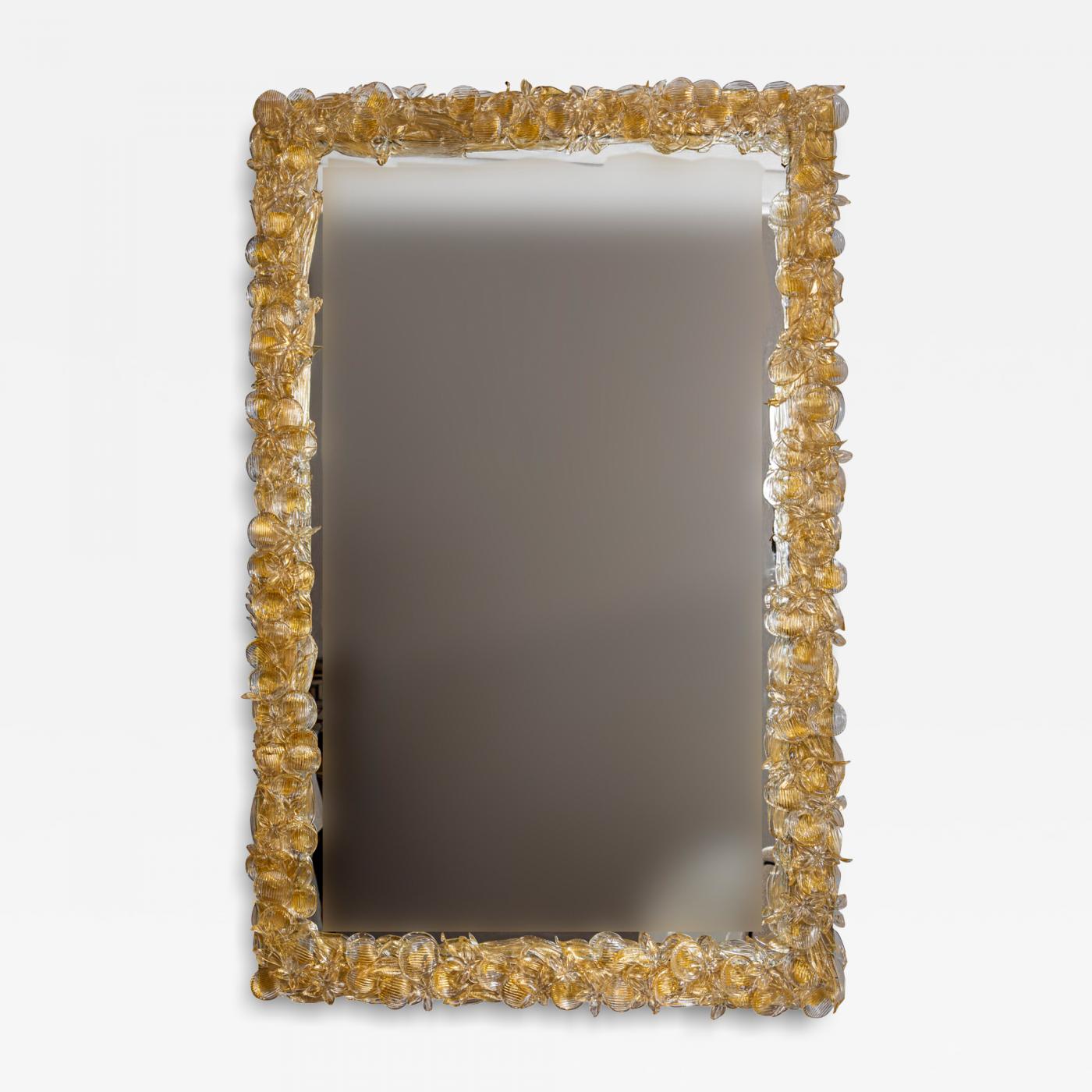 An artfully composed Venetian mirror filled predominately with 24k gold blown ribbed seashells, starfish and a variety of gold blown reeded leaves. Each piece unique and thoughtfully composed.