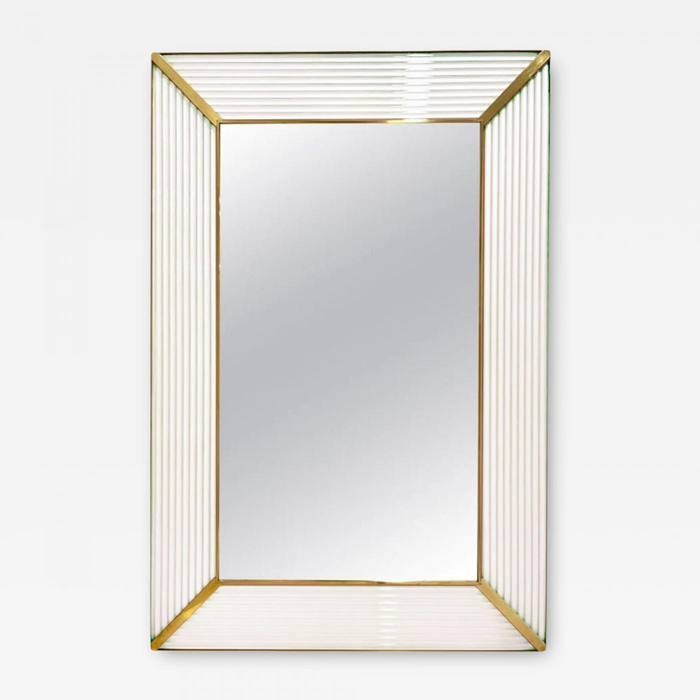 This Couture Design rectangular wall mirror, custom made in Italy, is framed with a thick border in high quality blown Murano art glass in white color, artistically decorated with an Art Deco style ribbed pattern that catches the light. High quality of execution with the wood back enclosed in a handcrafted brass border and the mirror plate edged with a brass border. The corners are highlighted with a brass detail which adds to its depth. The glass can be in any color of the RAL K7 Classic Color Gloss Chart. Contact us with your requirements.