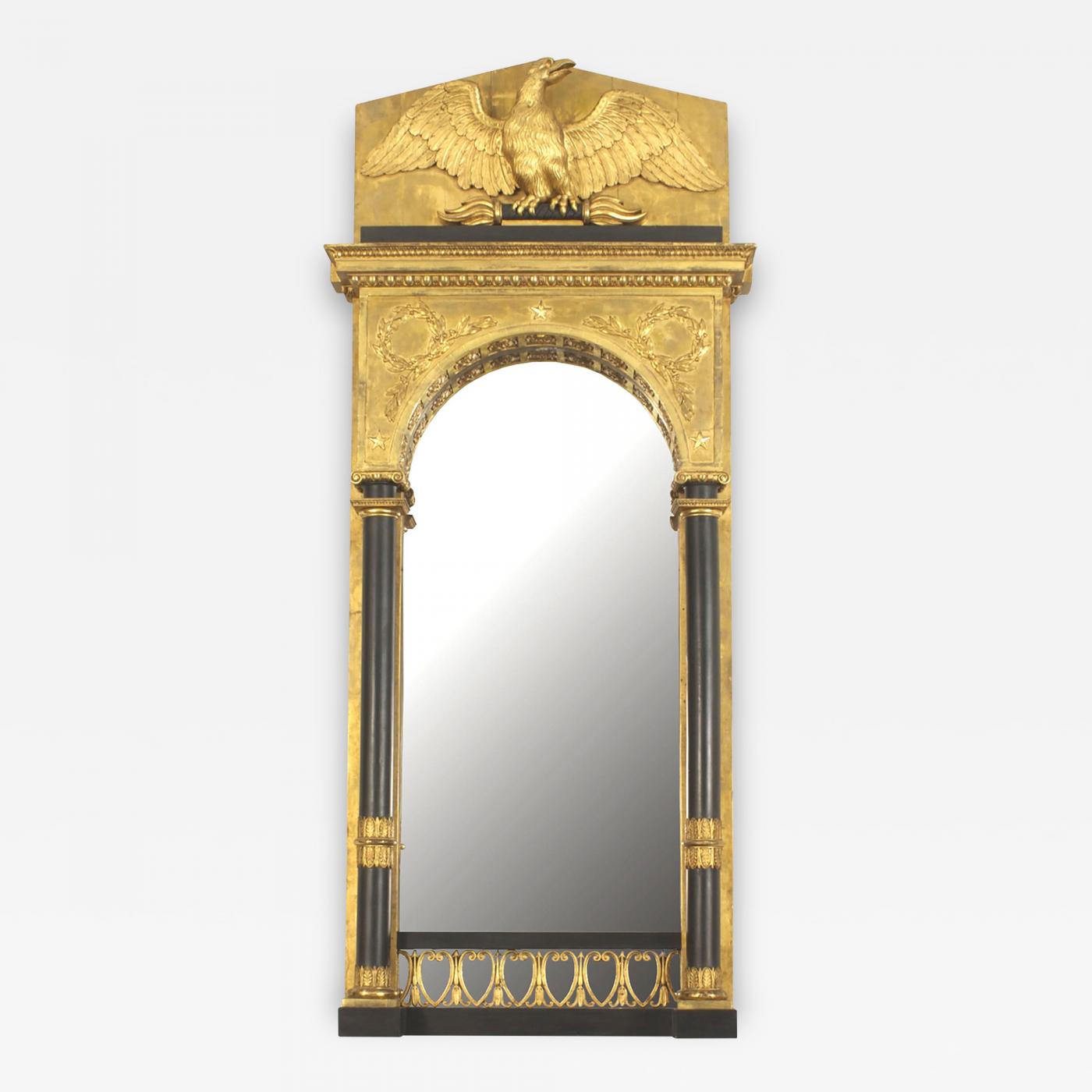 Continental Swedish Empire gilt wall mirror with ebonized column sides and trim and a carved eagle pediment over an arch form mirror.