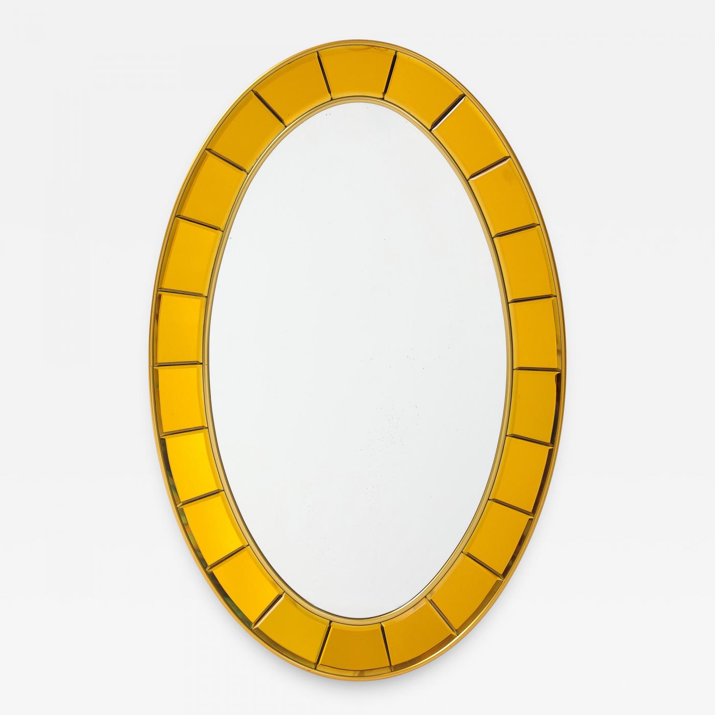 Cristal Art exquisite original oval mirror model 2727 with gold hand-cut, beveled crystal glass pieces framed by gilt brass borders and mirrored glass on a wooden backing. This stunning mirror is hand-crafted with intense gold beveled mirrored glass pieces beautifully complimented by the gilt brass trim. This elegant mirror is a quintessential mid-century Cristal Art design.