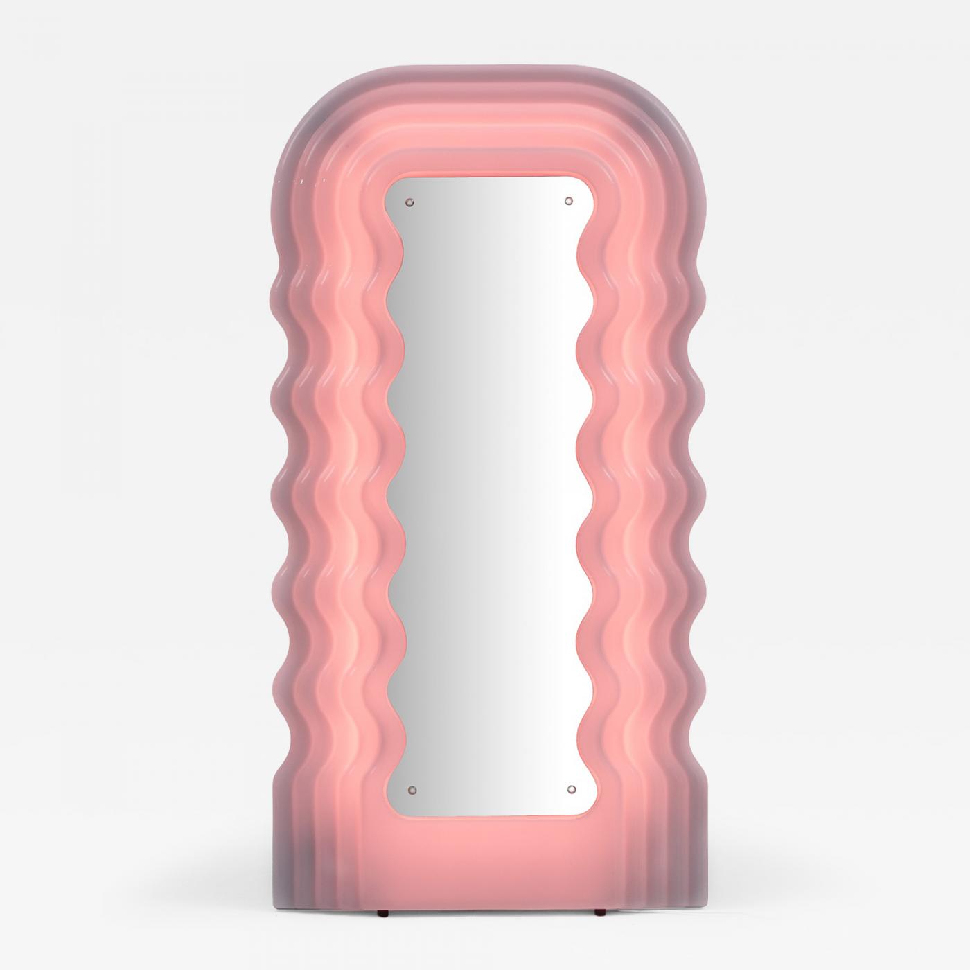 The mirror is framed by a dramatic undulating form in molded plastic, its organic silhouette resembling flowing hair or liquid waves. Integrated lighting runs through the frame, diffused through the translucent surface to produce the signature soft pink glow that has made the Ultrafragola one of the most recognizable lighting mirrors ever produced. The effect is both theatrical and intimate, transforming the object into a luminous architectural element rather than a simple mirror.