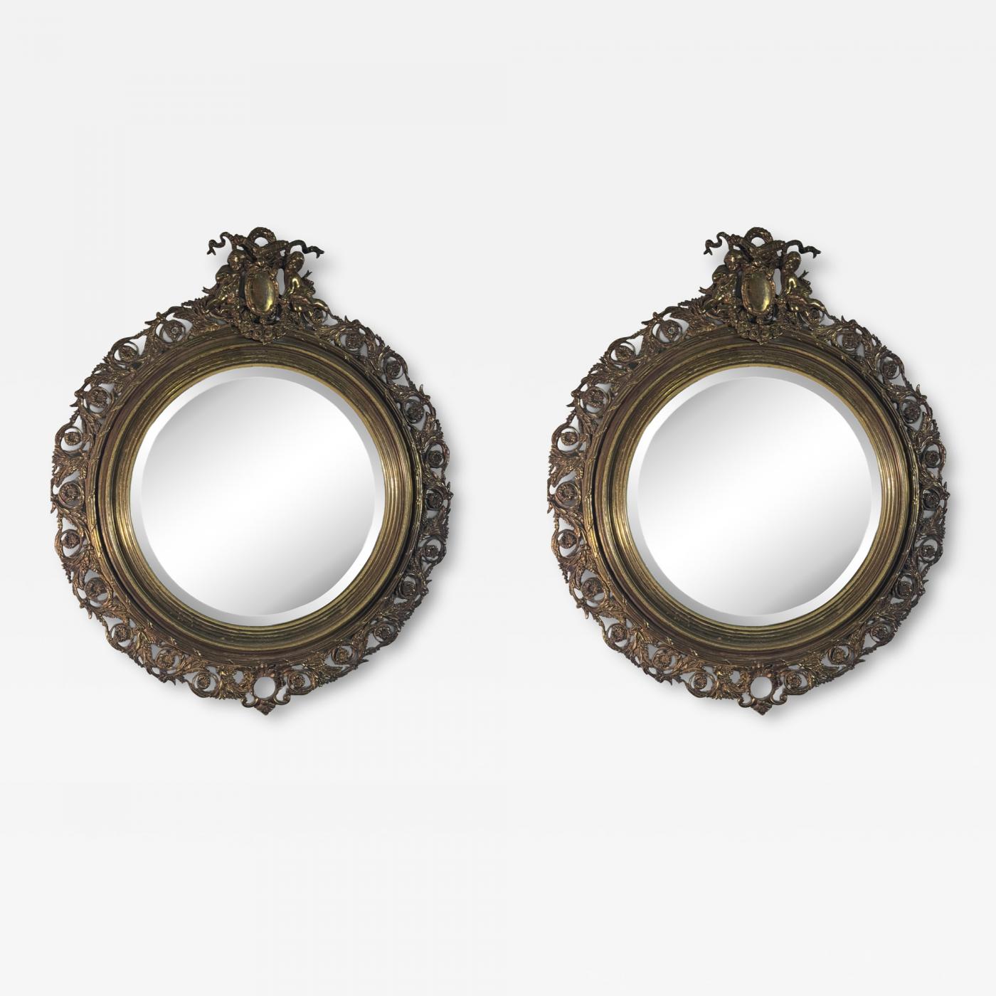 EXCEPTIONAL PAIR OF CHERUB & FLOWERS BRONZE ANTIQUE ROUND MIRRORS