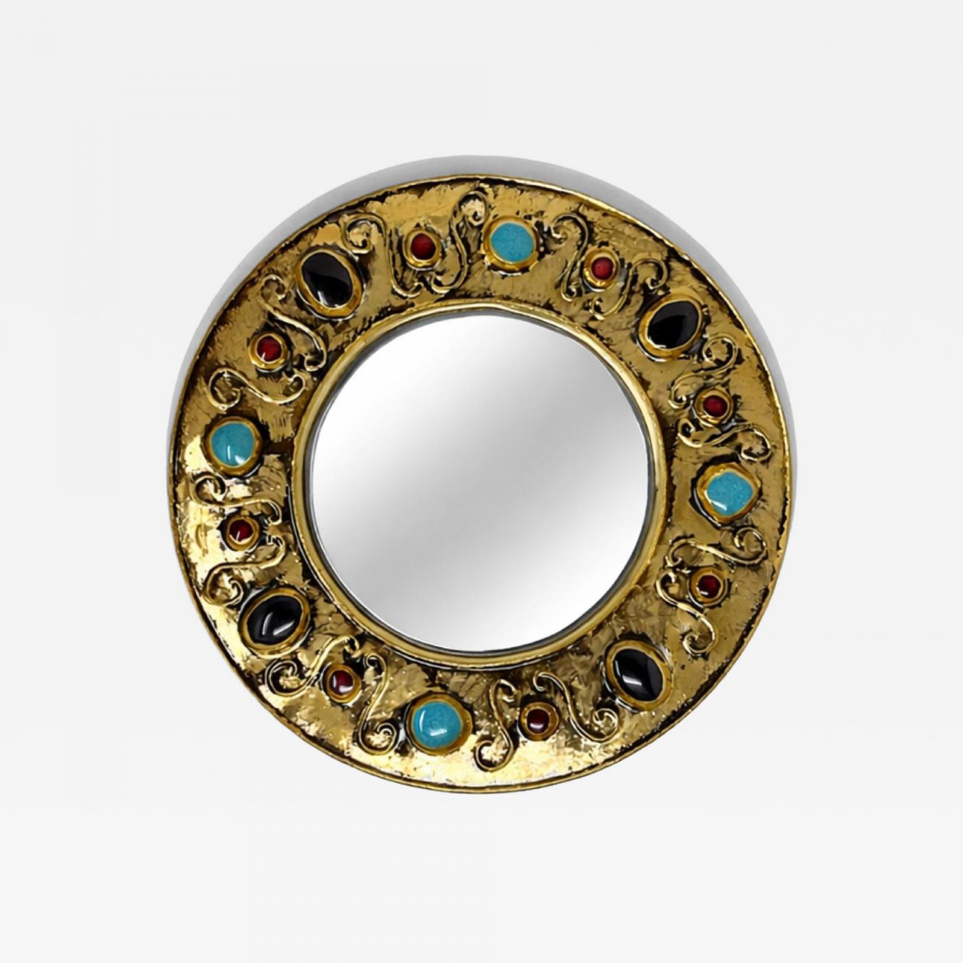 Medium-scale ceramic wall mirror by François Lembo, produced in the 1970s. The mirror has a circular form and is finished in a rich gold glaze, decorated with raised scrolling relief and jewel-like enameled cabochons in turquoise, red, and black.
