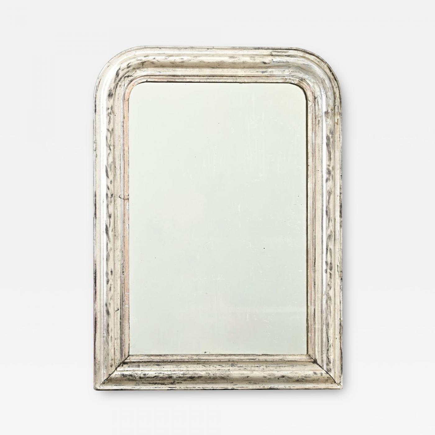 A French 19th century Louis Philippe mirror with an understated, silver gilt frame enhanced by dark oxidation and craquelure texture. Etched into the frame is an elegant, scrolling floral motif like iris that is interrupted by a few cracks and areas of wear which give authentic patina to the design. The original mirror plate is spotted with foxing in the glass, otherwise the reflection is quite clear. This gorgeous mirror will be right at home in many decorating tastes. Please view the detailed images to see more. -