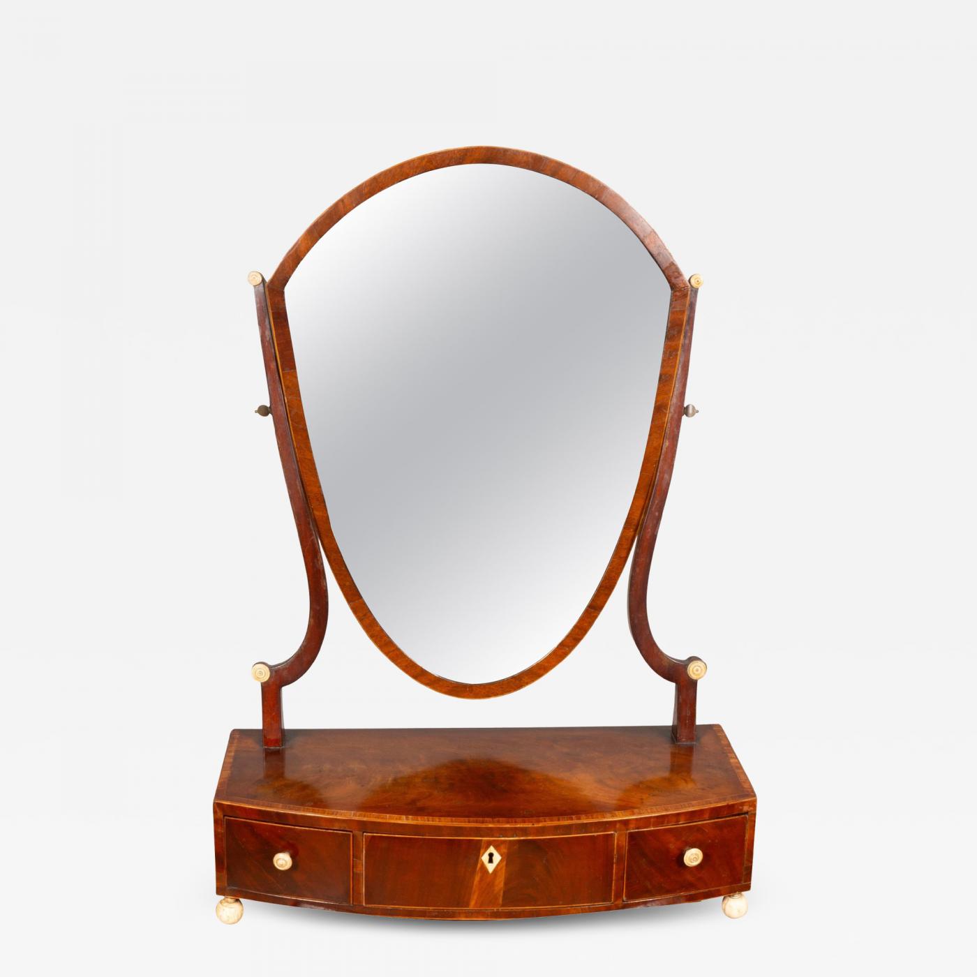 With a shield shape mirror with two supports to enable adjustment. The bow front cross banded base with drawers. Ball feet. Typically a bedroom piece to place on a chest of drawers.
