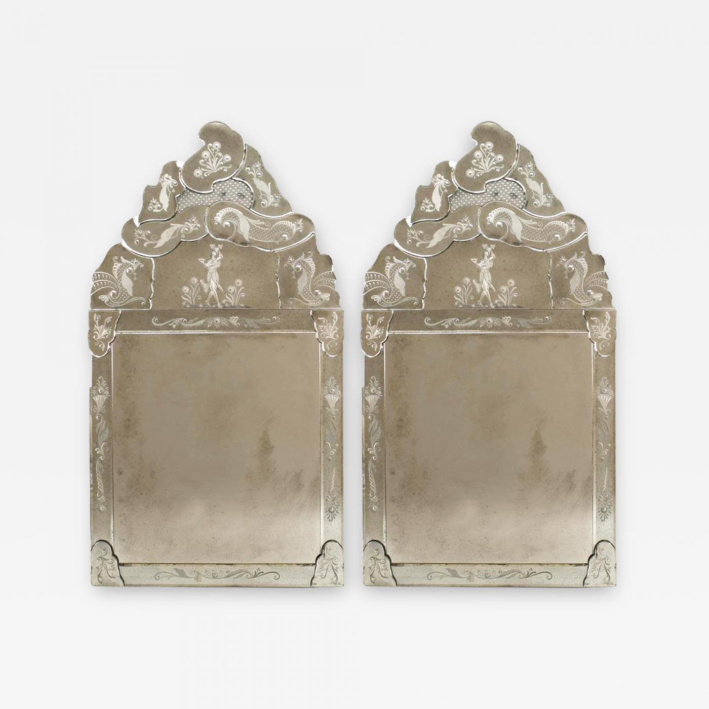PAIR Italian (late 19th Cent) Murano mirrors with applied glass panels and reverse etched floral & scroll designs with lady figure and shaped pediment. (possibly SALIR)