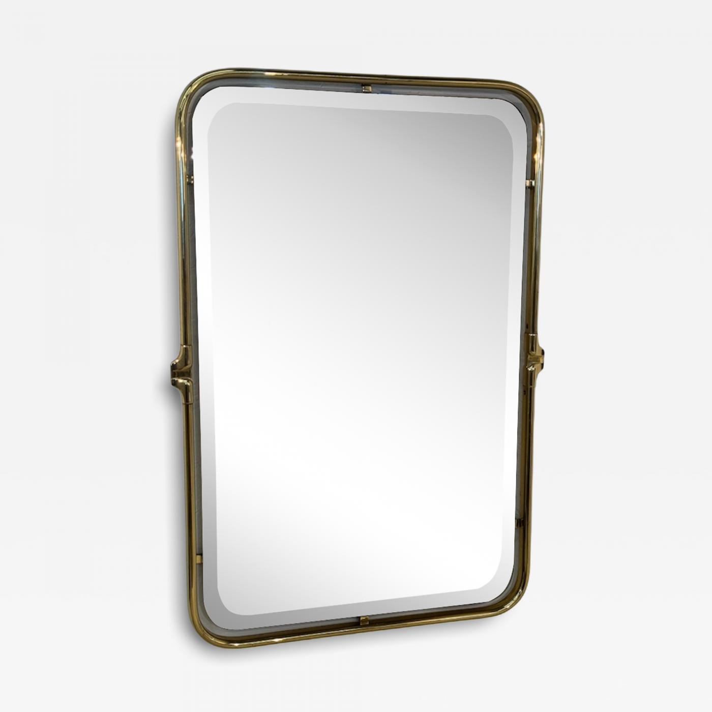 A sophisticated Italian wall mirror in a rectangular form with gently rounded corners, framed in polished brass. Subtle design details, including elegant side mounts, enhance its mid-century character while maintaining a clean and timeless aesthetic. The warm brass finish adds depth and richness, making this mirror an ideal accent for living rooms, bedrooms, or entryways. Both functional and decorative.