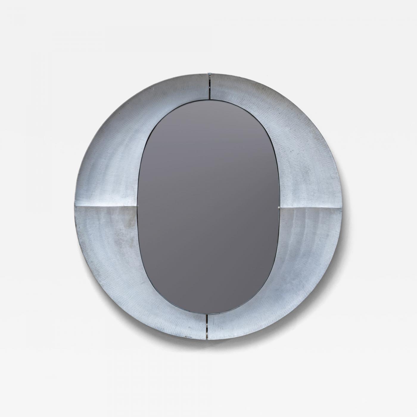 Sculptural Modernist mirror by artist Lorenzo Burchiellaro, featuring an oval mirror pane set within a textured cast aluminum frame of slightly concave form. Stamped Burchiellaro on the lower edge.