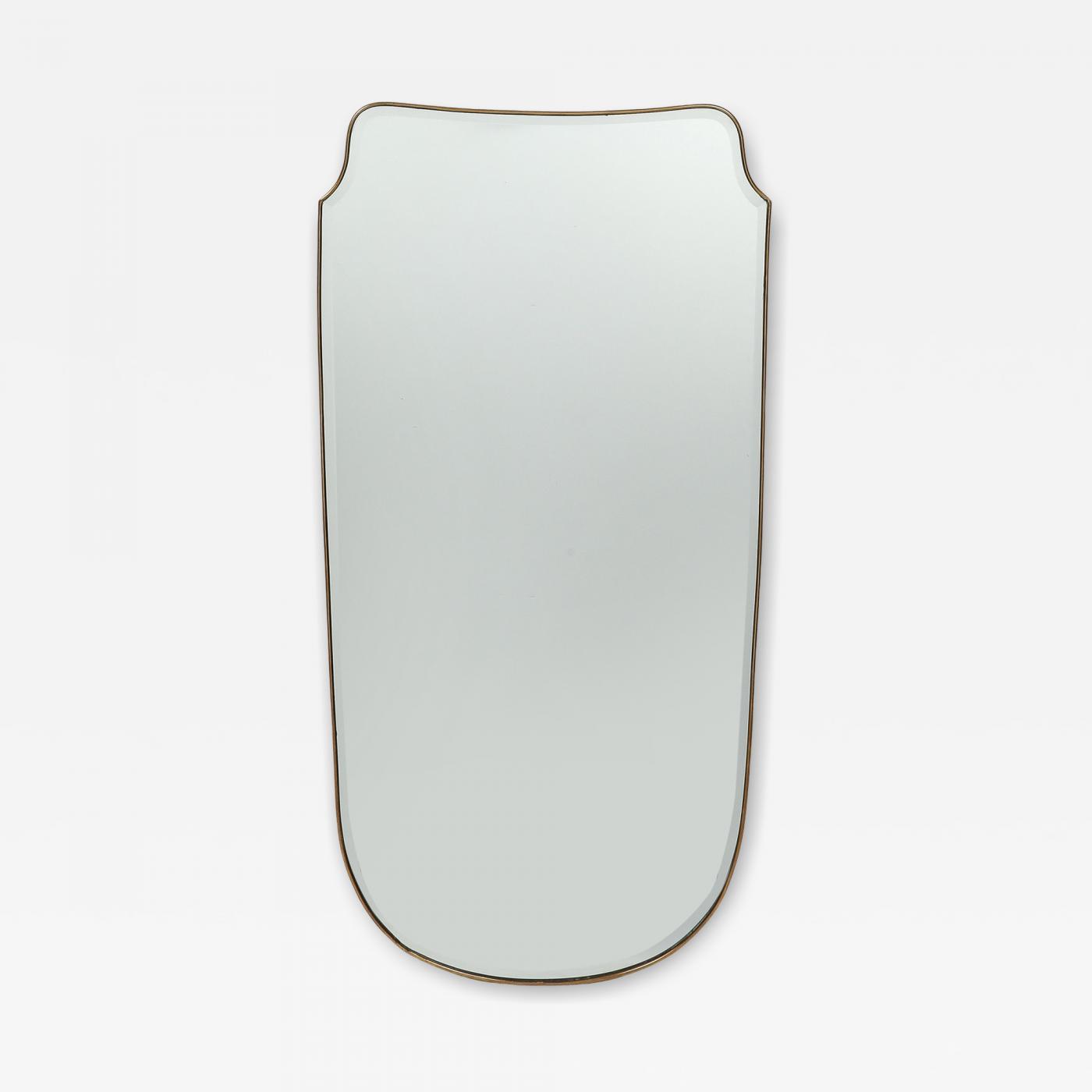 Midcentury Italian exquisite grand scale shield shaped brass beveled mirror with wood backing and lined with felt, 1950s. This original midcentury period mirror has a beautiful rich patina to the brass, elegant soft curves, and gently tapering rounded bottom. This sophisticated mirror with its lovely shield shaped form, original aged beveled mirror plate, and in this large bold scale is sure to command attention to any interior whether classic or modern.