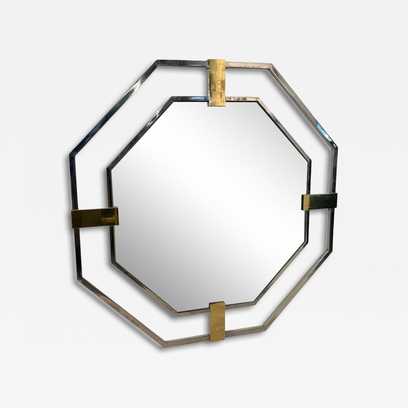 A bold Italian octagonal wall mirror framed in polished chrome with striking brass corner mounts. The geometric design highlights the mirror’s architectural quality, while the contrast between cool chrome and warm brass creates a refined modernist aesthetic. This statement piece embodies mid-century and Hollywood Regency influences, making it ideal for sophisticated interiors.