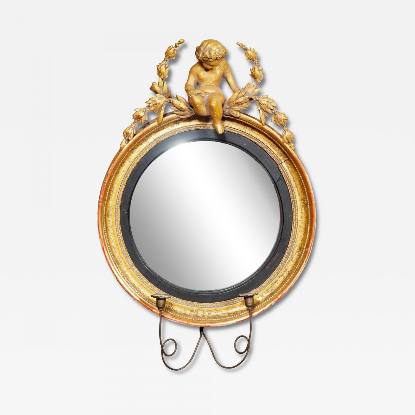 With putti and laurel leaf wreath over a convex mirror plate with ebonized border. Two candle arms.