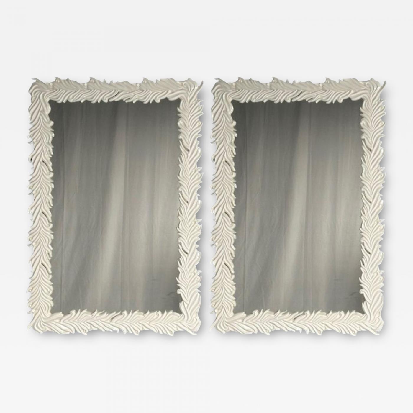 Pair of sizable wall mirrors in the mid-century taste inspired by the work of Serge Roche. Each example features a hand carved wood frame having a palm fronds or leaf motif finished in a high gloss white lacquer. Two mirrors available now - can be made to order in different sizes or colors with a lead time of approximately 12 weeks. One pair in a high gloss black lacquer is available now as well.