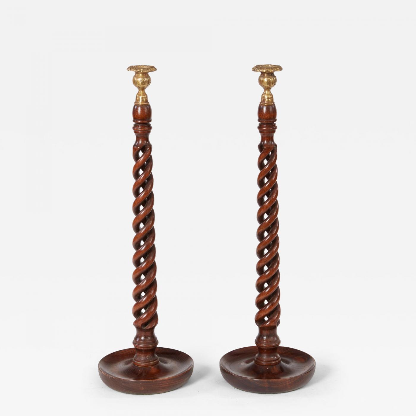 A pair of tall oak candlesticks with open twist-carved shafts and dished bases, the tops with brass bobeches of foliate design. Great scale and patina.