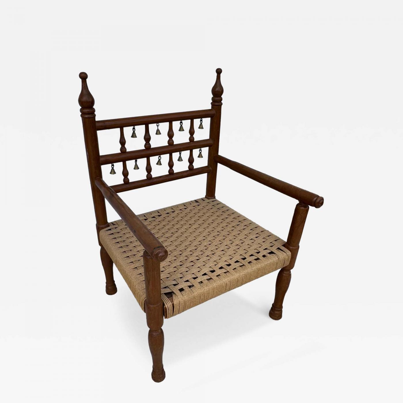 1970's Punjabi Wedding Chair in Teak with Rush Bottom Seat and Brass Bells