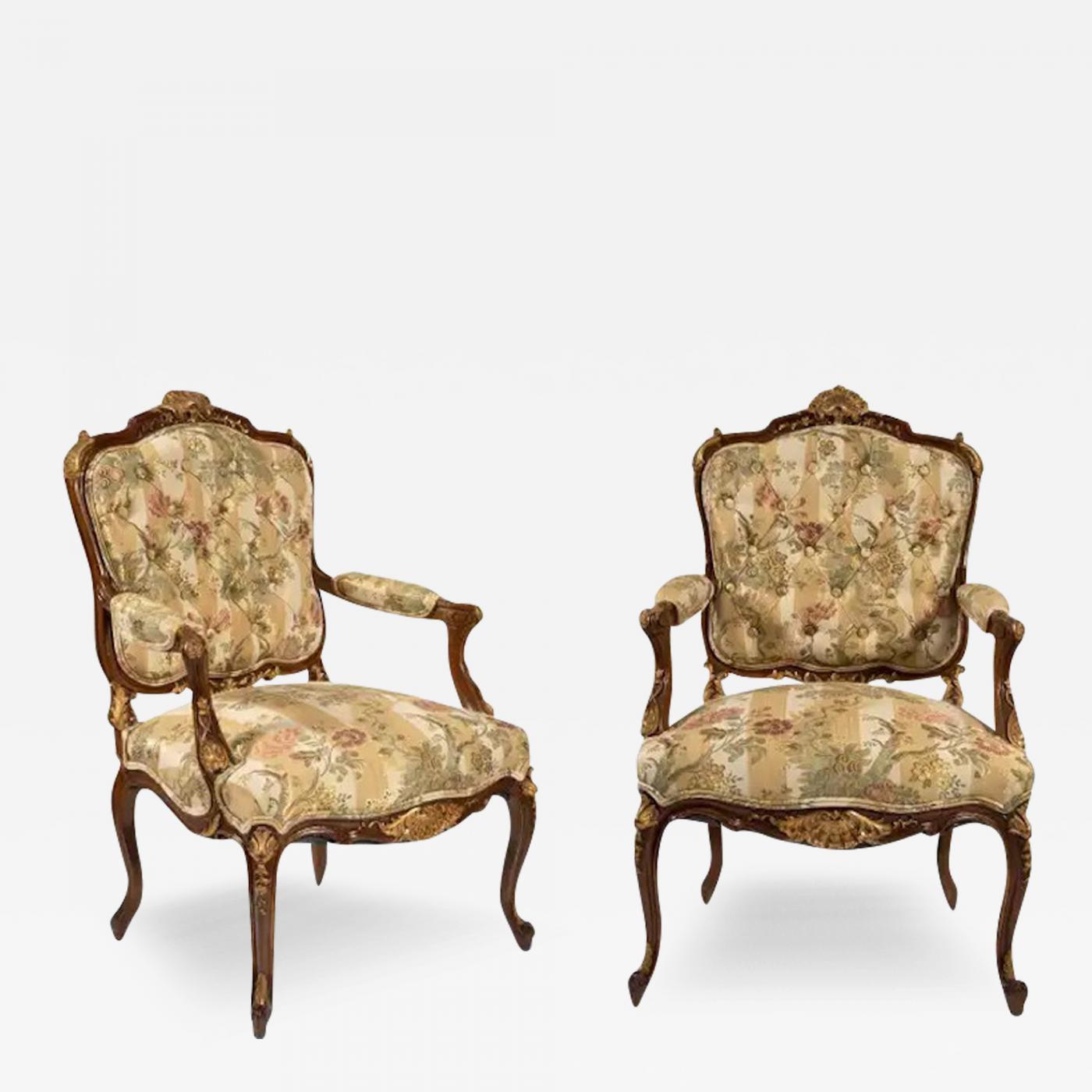 Immerse yourself in the opulence of our exquisite mid 19th-century French Louis XV parcel gilt walnut patinated framed bergères armchairs. This decorative pair showcases unparalleled craftsmanship and timeless design, making them a statement piece for any discerning collector. Adorned with intricate carved and gilt decorations, the frames of these armchairs boast the elegance characteristic of the Louis XV style. The beautiful silk damask fabric upholstery adds a touch of luxury, with a tufted back that enhances the visual appeal.