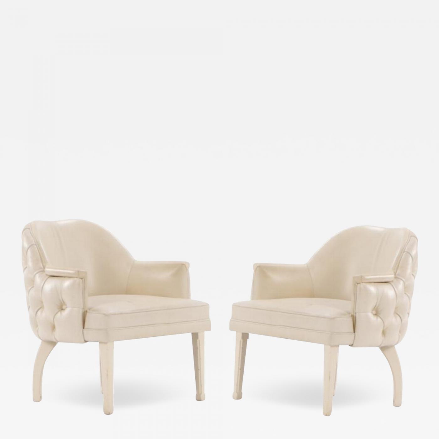 A pair of French leather club chairs C 1970. Having exceptional button back upholstery, the straight front legs and curved back legs are lacquered to match the leather. This very comfortable pair of chairs would make a chic and neutral addition to a living room or bedroom sitting area. (RR# 61514)