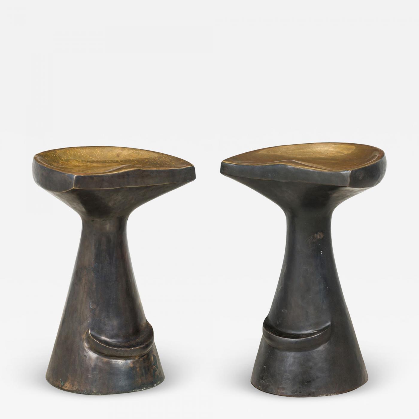 Depth: 13.5" // 4 "Beatriz" counter stools featuring an industrial / biomorphic design that combines an organic form of a brass seat and contrasting dark patinaed textured base into a work of sculptural modernism.