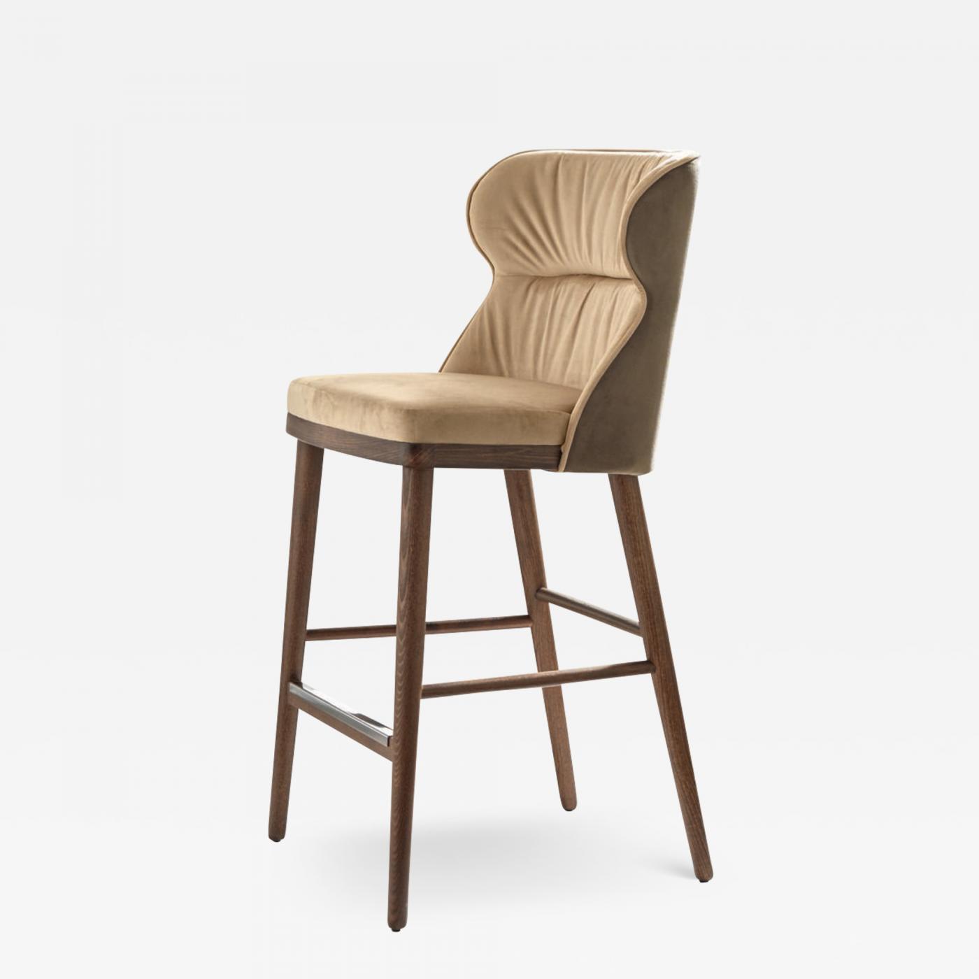 Fenice stool raises its eclectic spirit bringing the comfortable seat of the homonymous armchair to another height providing different solutions for modern counters or kitchen islands. Ash-wood structure is coated in soft, bicoloured, velvet fabric.
