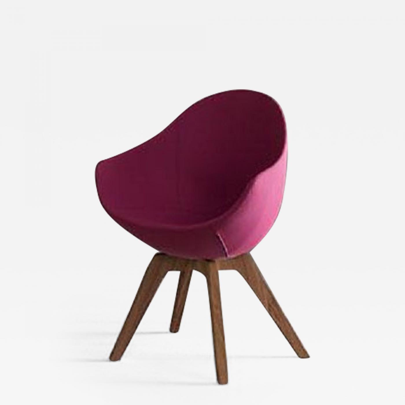 The particular shape of Jane armchair creates a perfect combination between comfort and design. The wrap-around seat gracefully matches both with its fixed wooden base and with its more dynamic swivel metal base.