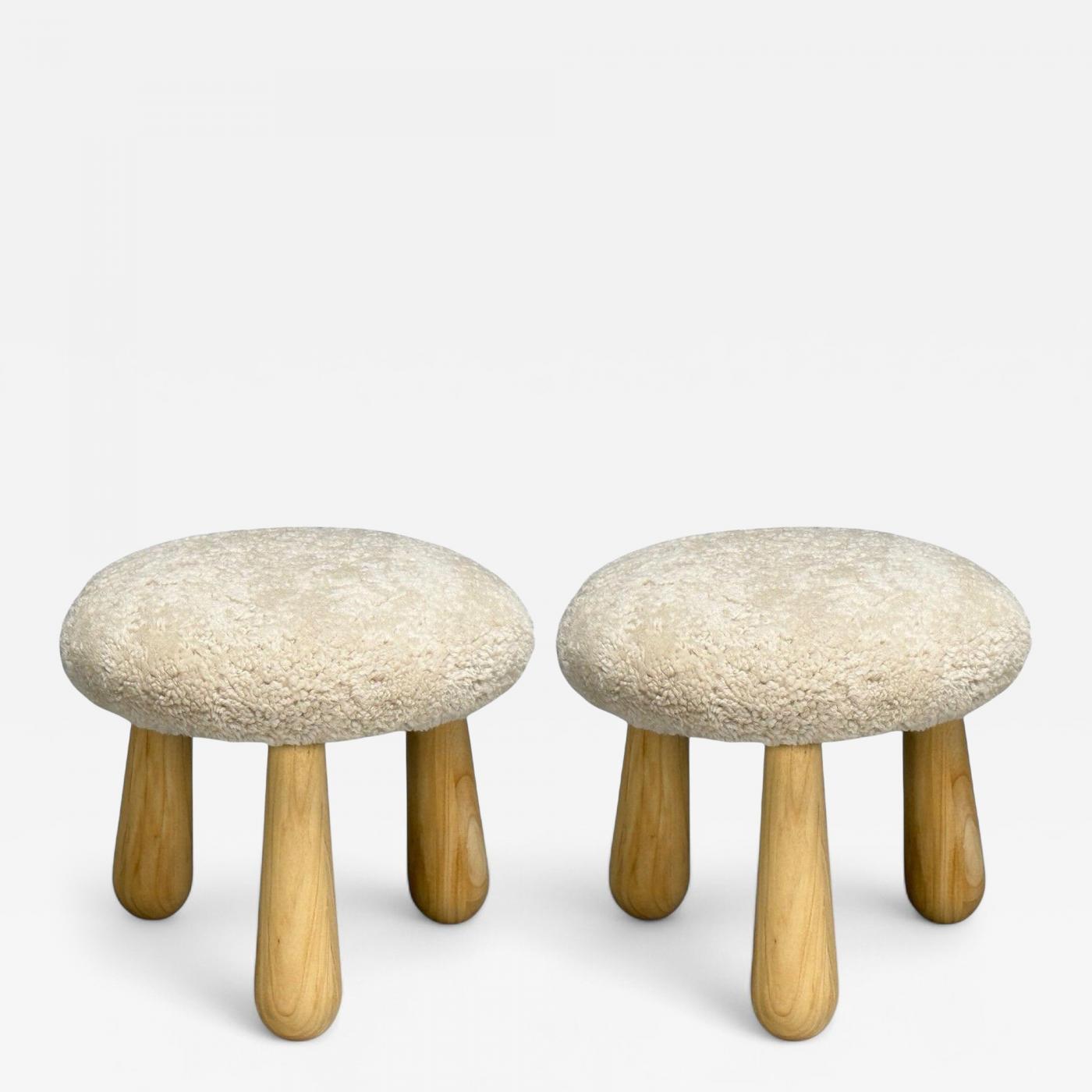 Danish Modern Style, Sheepskin Stools, Beige Shearling, Maple, USA, 21st c.