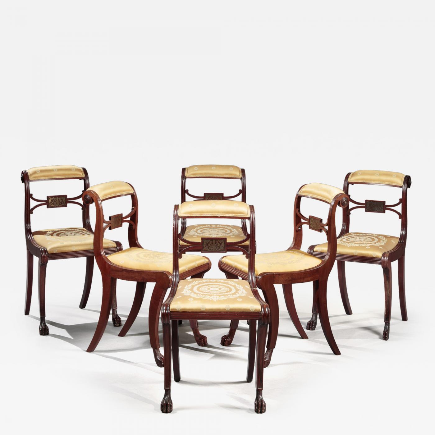 SET OF SIX CLASSICAL CARVED AND BRASS INLAID KLISMOS SIDE CHAIRS