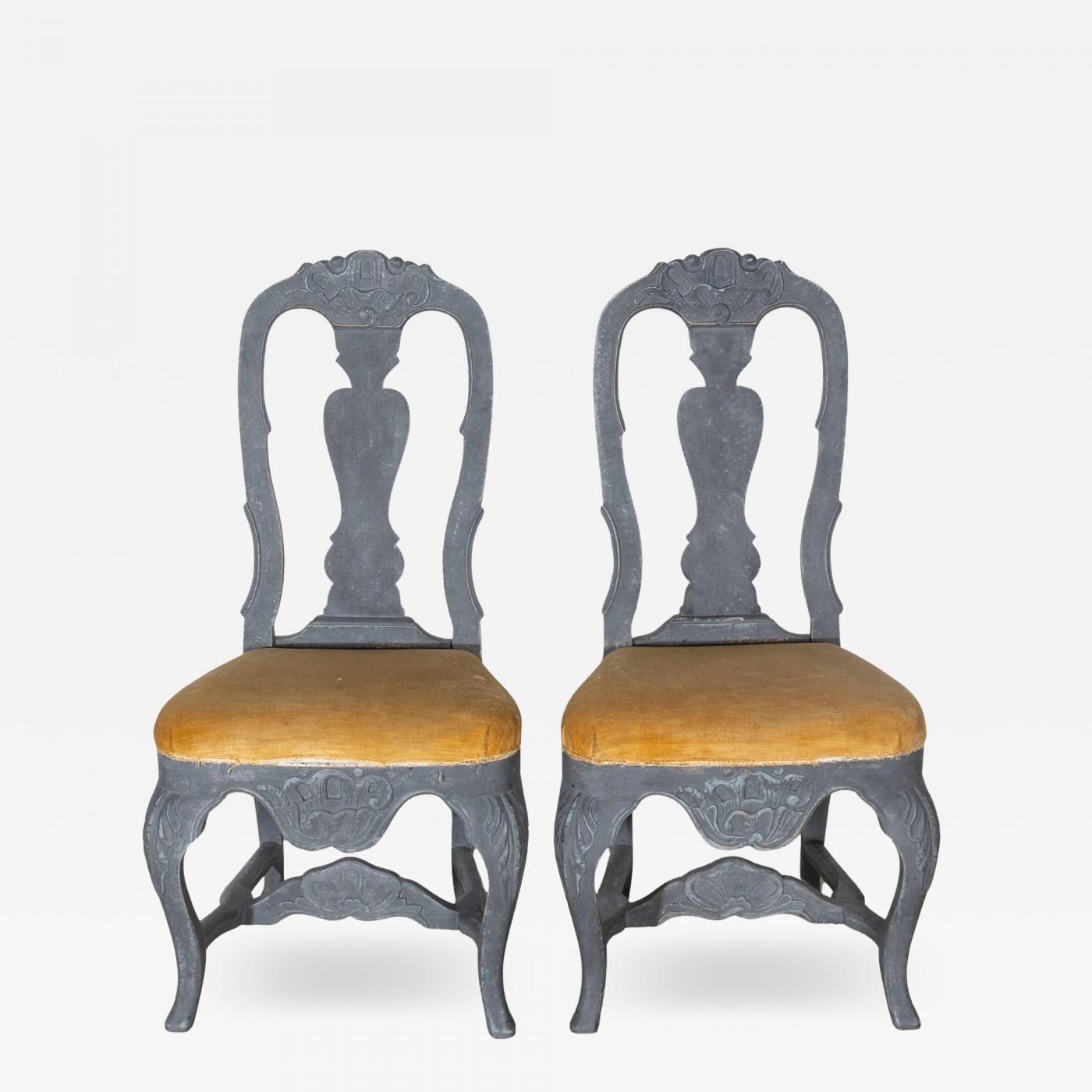 This fine pair of 19th-century Swedish Rococo chairs blends sculptural elegance with a bold, moody palette. Painted in a rich matte black, the chairs feature gracefully contoured balloon backs, carved with floral and foliate motifs emblematic of the Rococo period. The curvaceous apron and cabriole legs showcase intricate relief carving, lending a sense of movement and refinement to the silhouette. Upholstered in a golden mustard velvet, the seats add a warm contrast and a subtle note of opulence. These chairs exemplify the Swedish interpretation of Rococo design, lighter and more restrained than their French counterparts, yet no less captivating. Perfect as accent chairs in a foyer, flanking a console, or as a dramatic pairing in a bedroom or study, they offer timeless character with a contemporary edge. Structurally sound and visually striking, this set is a testament to the enduring beauty of Northern European craftsmanship.