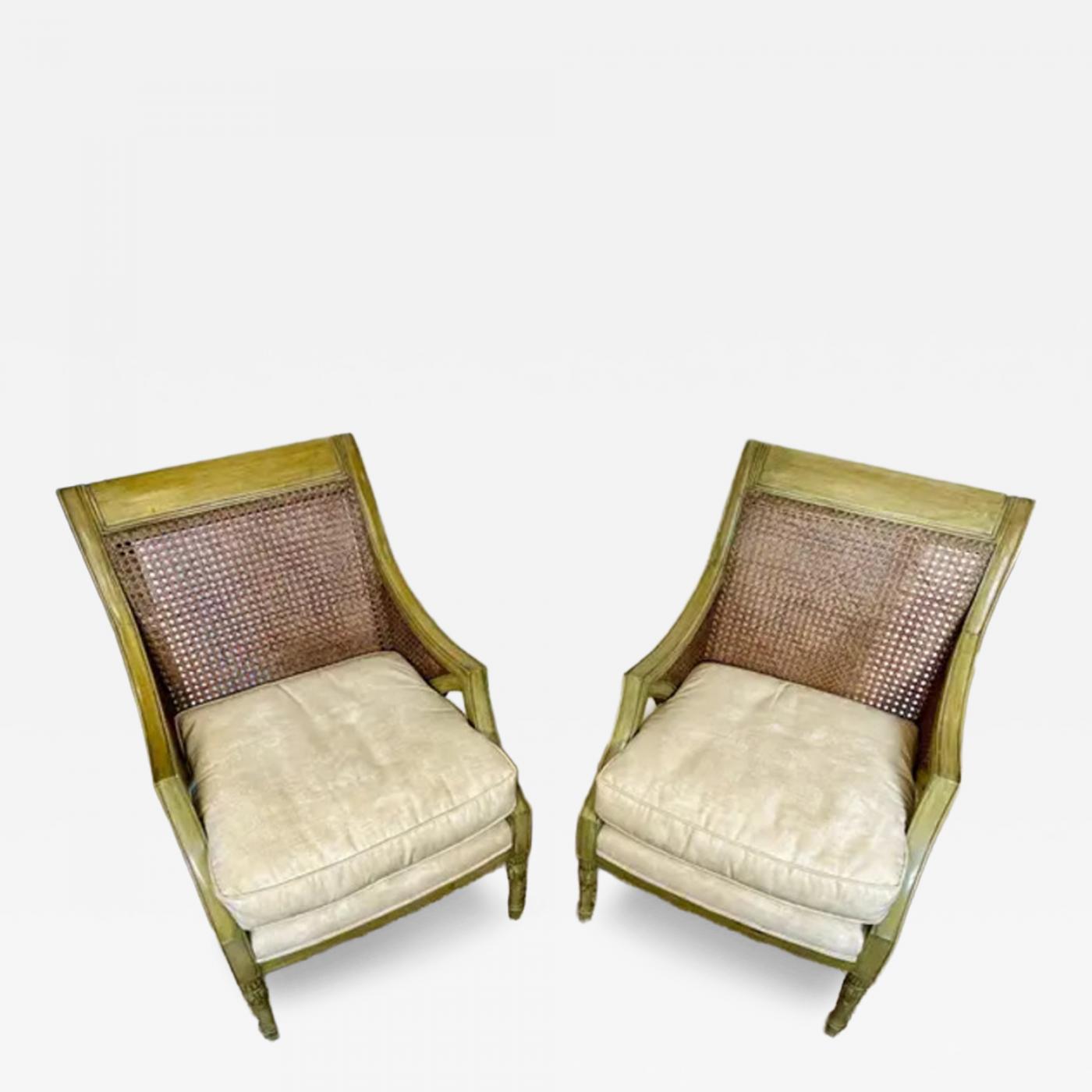 French Caned, Painted Bergere Chairs, Louis XVI Style, Loose Seat Cushions, Pair