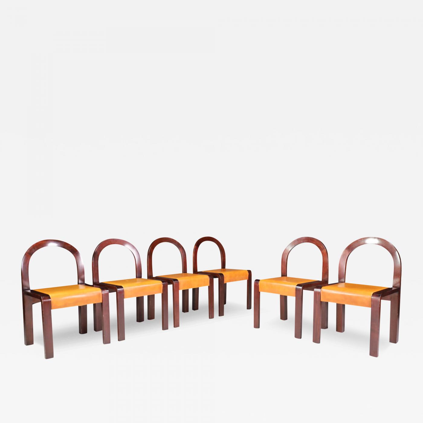 Purchased in Italy and attributed to the important Italian architect Gae Aulenti (1927-2012) who was multi-talented and best known for her work in museum design. This set has similar lines to the designs produced by Knoll - yet with an open architecture. Constructed in lacquered walnut with curved lines to the back and frame to conjure simple elegance. Beautifully contrasting light cognac leather seating. Set of six. 1960s Italy. Seat height is 17.8".