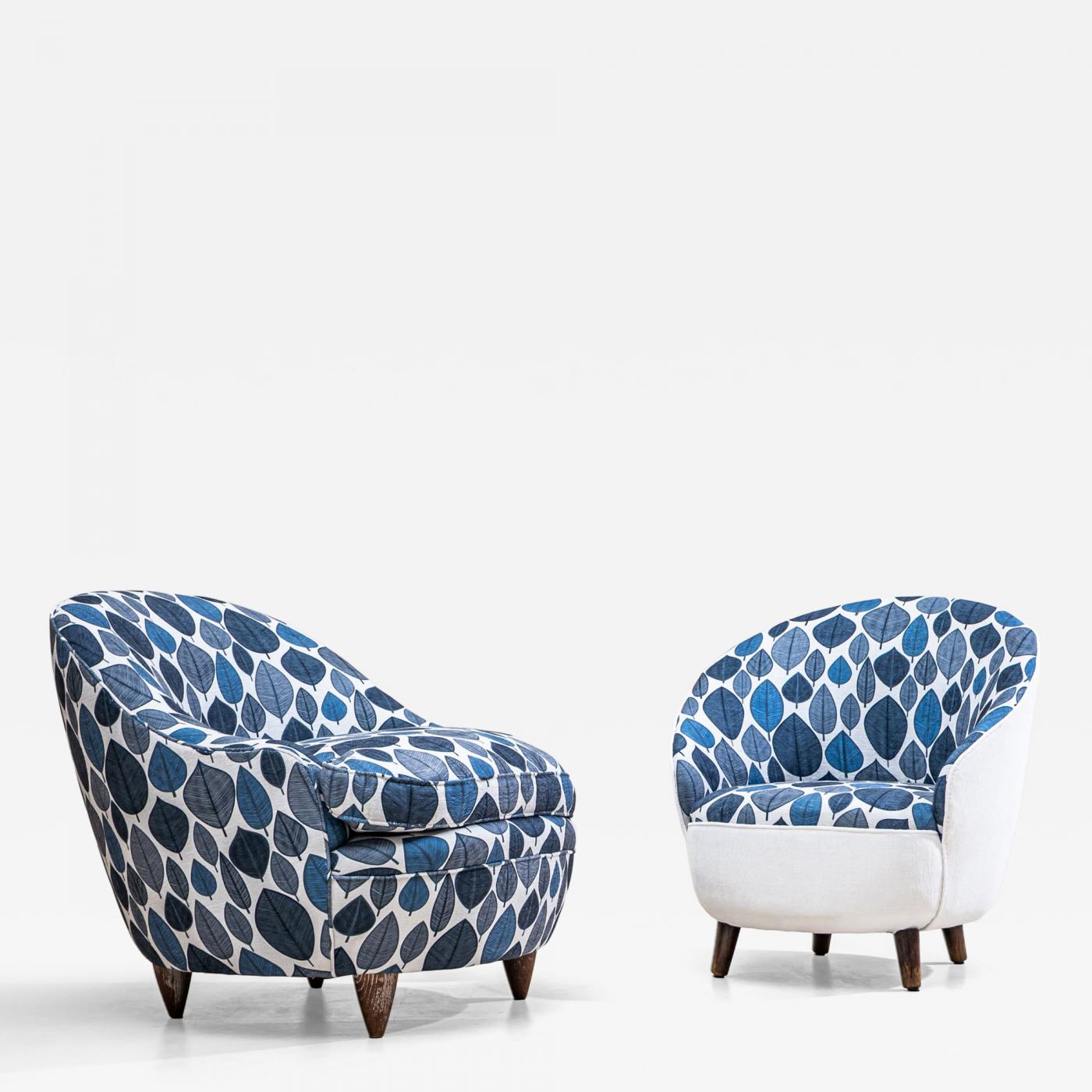 Pair of armchairs in slightly differing executions, raised on tapered wooden legs. The shells are upholstered in blue fabric with leaf motifs. Designed by Gio Ponti (1891-1979) and first exhibited at the VI Triennale di Milano in 1936. Both armchairs are accompanied by expertises of the Gio Ponti Archives.