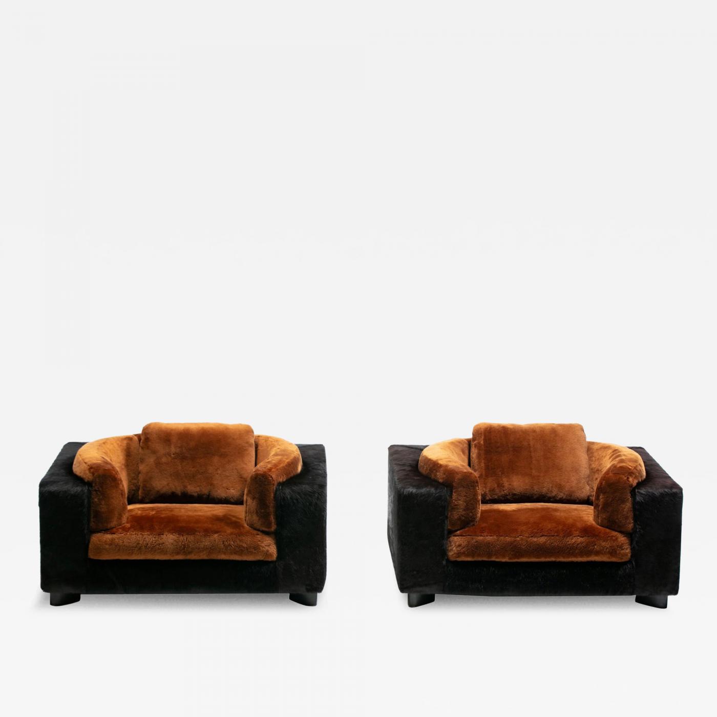 Inspired by the black and tan interiors of chic and fast Italian and German sports cars our shop clad these monumental sized Gucci lounge chairs in soft and cascading long haired black cowhides and plush milk chocolate shearling hides - all artisan hand sewn for your pleasure. Pedal to the metal, you'll love the ride in these smoking hot incredibly luxurious Italian lounge chairs. Large and meant to impress. These lounge chairs easily carry big living spaces making them a great choice for large rooms and big open floor plans. Cigar lounge. Bedroom overlooking the skyline. Aspen Modern Château with big walls of glass on a snowy night fireside. Sultry living room filled with art. Yes all the way. The lines are 1970s chic and perfect as ever with their boxed square profile guarding plush and soft inner cores with surround cushioning. Halston vibe. Long black cowhides drape and cascade down the arms like waterfalls with a confident sexy air. Shorter inner shearling core contrasts the black hides both in texture and color. A milk chocolate inner core that's melt in your mouth enticing and seductive. The "I made it" chair you'll cherish and feel like a celebrity enjoying. So enticing, all will inquire. You'll see.
