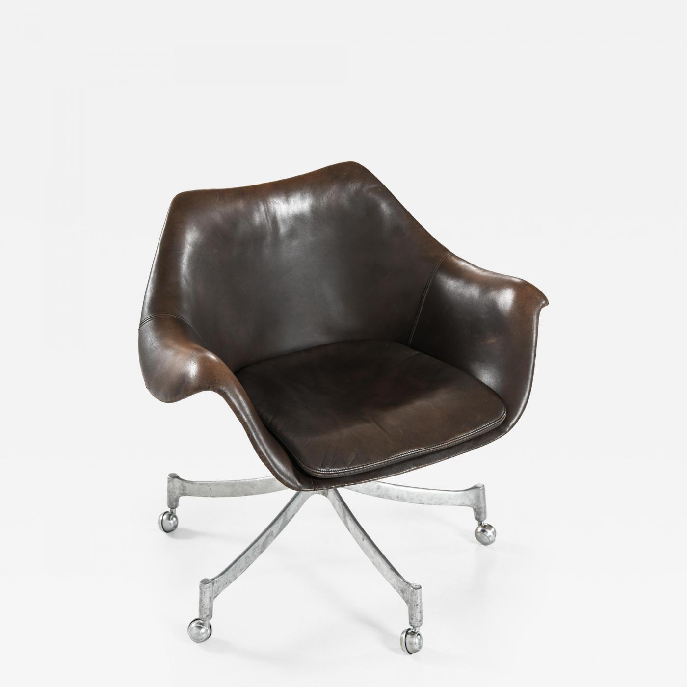 This very rare office chair, model 932, was designed by Jørgen Lund and Ole Larsen and produced by Bo-Ex in Denmark during the 1960s. The chair features an organically curved shell upholstered in its original dark brown leather, which has developed a rich patina over time. The leather shows natural wear including creases, minor surface scratches, and some discoloration, all contributing to the chair’s authentic vintage character. The seat cushion remains intact with firm padding, ensuring continued comfort and usability.