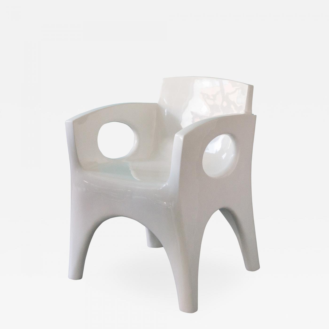 The Toro Armchair is a sculpted, modern seat by Jacques Jarrige, hand-carved from recycled wood and finished in a luminous white lacquer. Its powerful, compact form is softened by the artist’s signature curves, creating a functional artwork that embodies Jarrige’s ongoing exploration of movement, line, and negative space.