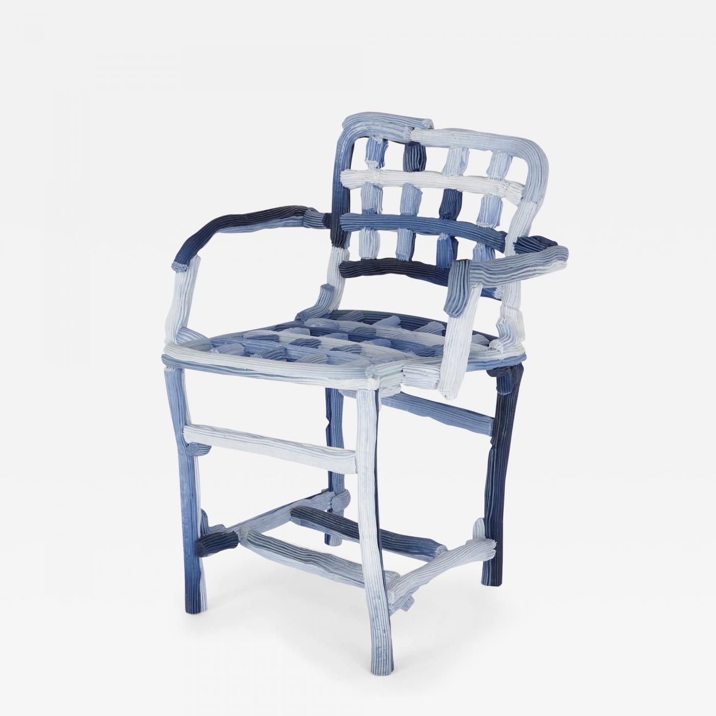 The chair is boldly coloured in various shades of blue ranging from navy to pale blue. The colour of the pieces is dictated by how much dye is left in the extruding gun, creating a sense of the unknown and making each piece unique. Each armrest is of a different geometrical form, producing a contrast between round and rectangular edges. The chair back and seat have been made from long horizontal pieces of extruded plastic held together by smaller strips. Such construction imitates a lace-like design.