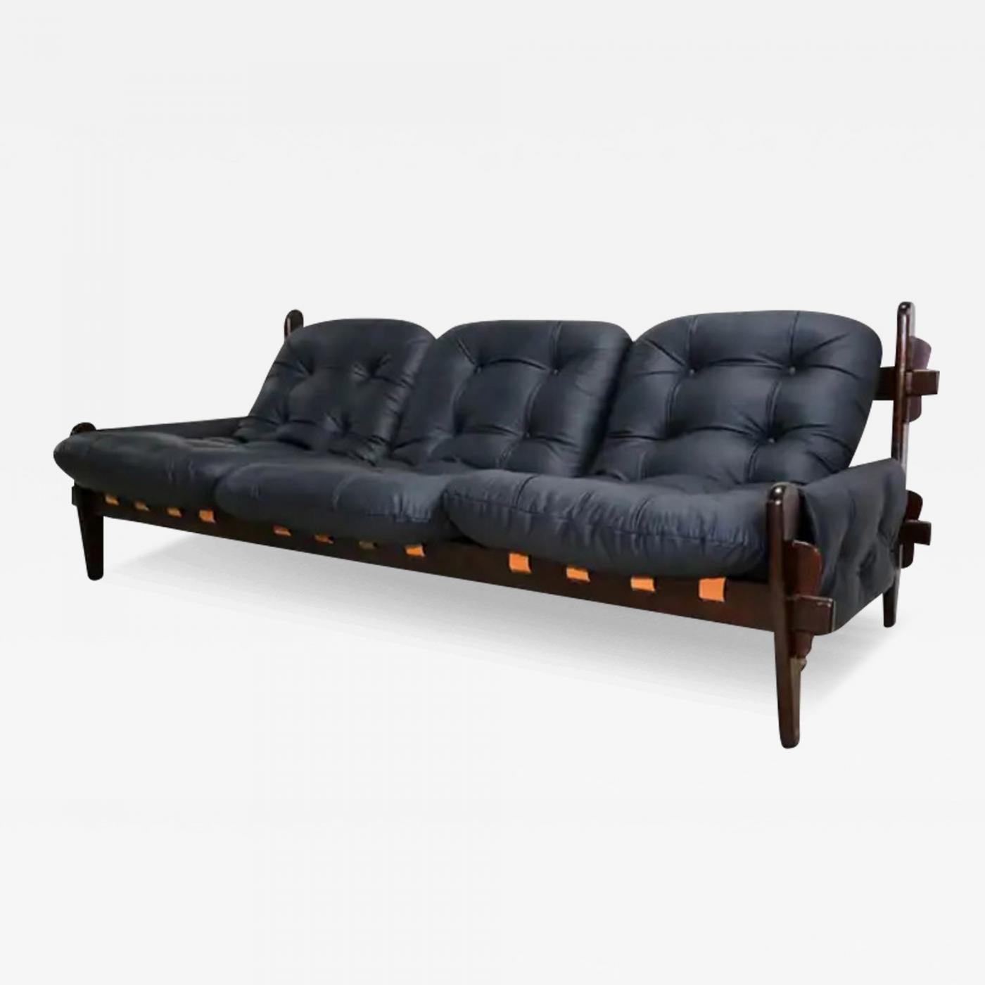 This gorgeous, one-of-a-kind three seat sofa features a solid Brazilian Rosewood (known as Jacaranda) structure with leather belts acting as supporting base for the three loose black leather cushions. Each cushion acts as a seat and backrest in capitone style resulting in a striking though very inviting comfy look.