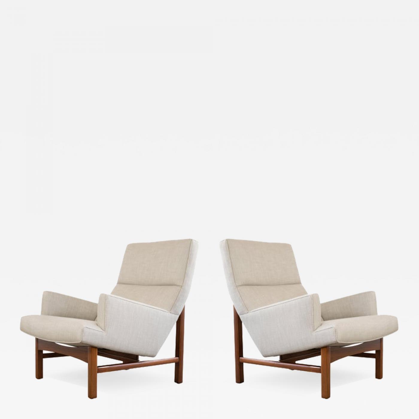 Low-slung pair of Jens Risom lounge chairs floating in solid walnut cradle frames. These chairs are very architectural in appearance with their tight lines and taut upholstery but are actually very comfortable. They have been restored to the highest possible standard.