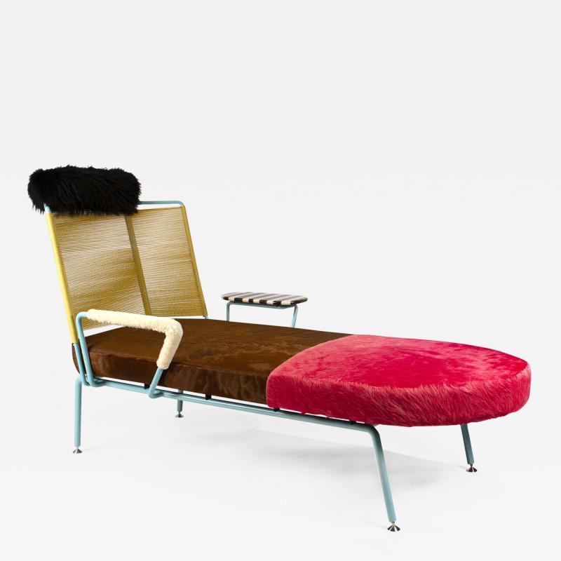 Chaise Lounge 'Custard Ma Ma' designed by London based artist Jonathan Trayte. Comprised of cowhide, sheepskin, raccoon fur, marble, powder coat steel and woven polyester cord.