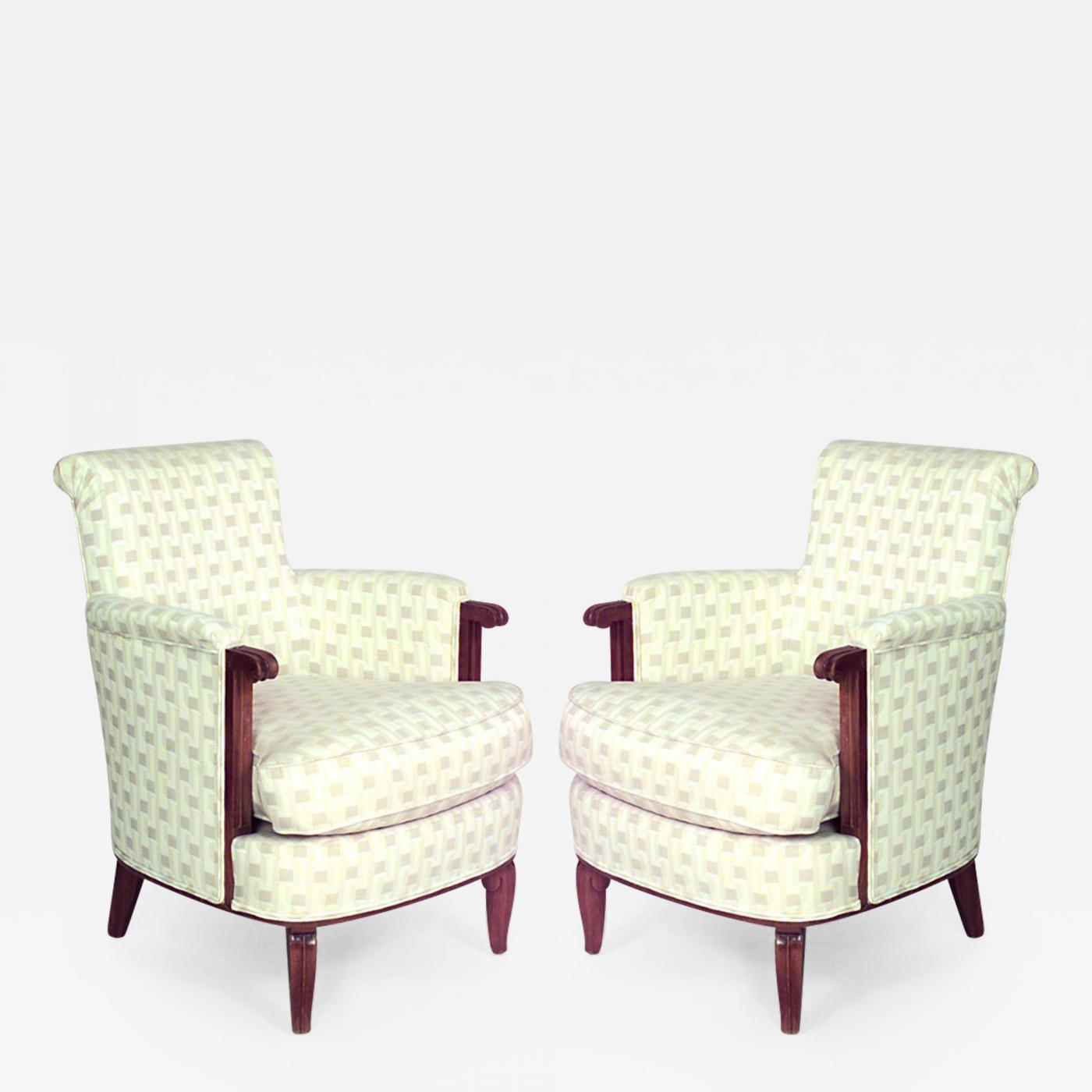Pair of French Art Deco mahogany bergere arm chairs with beige geometric upholstery (att: JULES LELEU)
