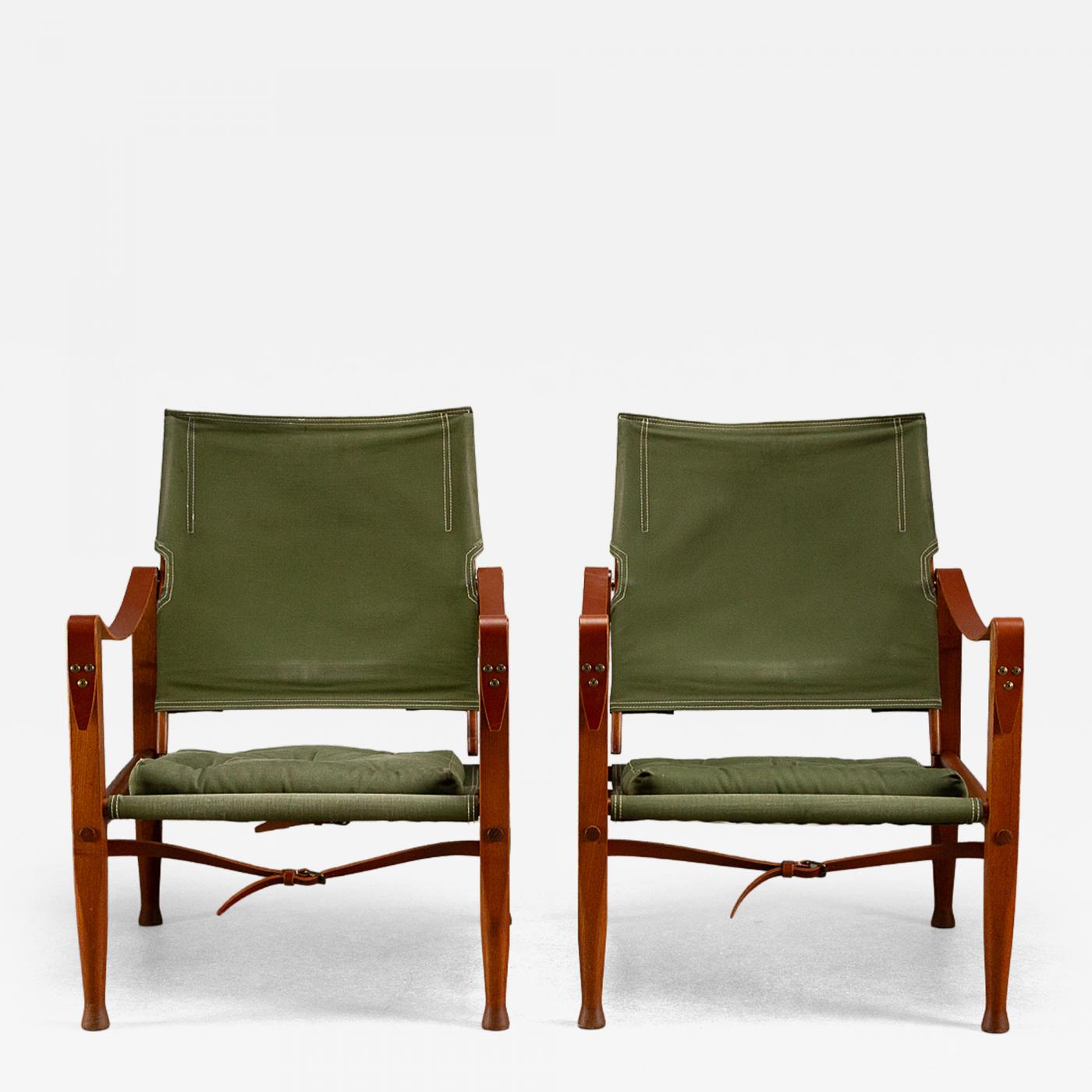 A set of two KK47000 safari chairs by Kaare Klint for Rud Rasmussen in original sage green canvas. Designed in 1933. Recent leather arm straps and leather stretcher straps and buckles. Great patina. Chairs can be disassembled for shipping. Denmark, 1960s. Visible repair on back of one chair – see photos. One brass dome nut has been replaced.