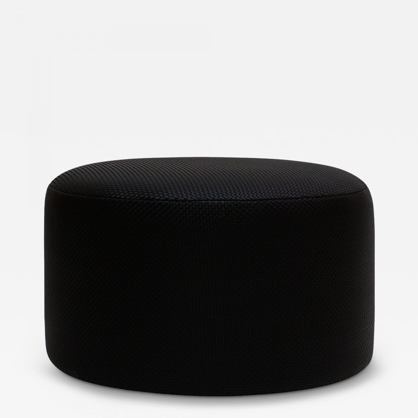 This contemporary pouf features a solid internal wooden structure and is fully upholstered in hand-braided black lambskin. The artisanal braiding creates a rich and sophisticated texture that gives the piece a distinctive character while emphasizing the craftsmanship behind its production.