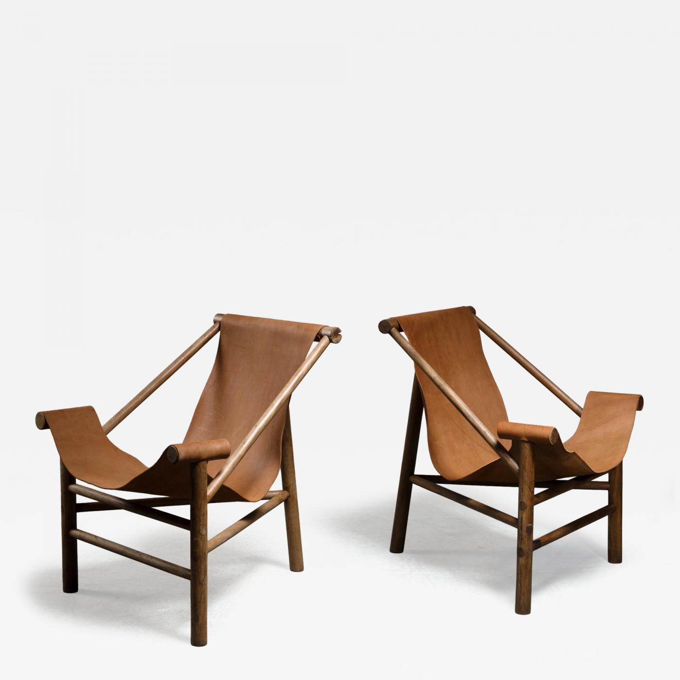 A pair of rare model Tripé chairs, designed in 1948 by Lina Bo Bardi. The chairs have a tripod wooden frame with a leather sling seating. Documentation present.