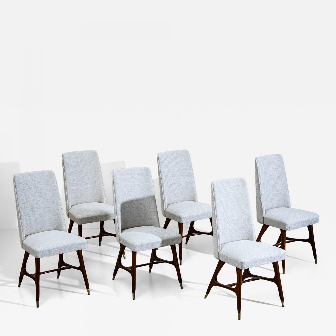 Set of six dining chairs from the 1950s featuring gently shaped frames in dark-stained wood with brass sabots. The rounded trapezoidal backrests provide both visual elegance and seating comfort. The frames have been carefully polished, and the seats have been newly upholstered in a high-quality light gray fabric with a subtle knit texture.