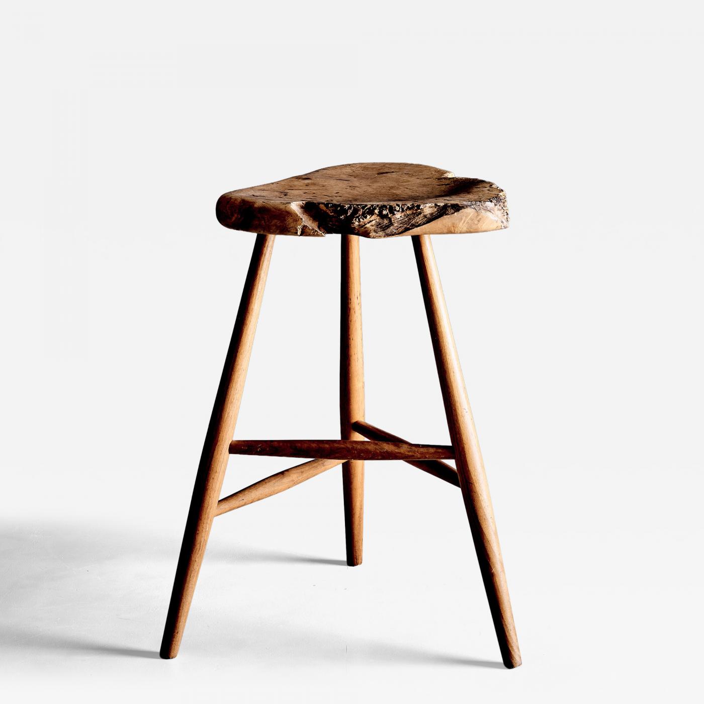 This studio crafted stool by Oregon woodworker Michael Elkan captures the meeting point between nature’s irregular beauty and refined craftsmanship. The seat, carved from a single slab of burl wood, retains its live edge — a rugged, textured reminder of the material’s origin. Its surface bears the natural marks and variations of time, giving the piece a tactile authenticity that mass production can’t replicate. Set on three slender, tapered walnut legs joined by simple cross stretchers, the stool balances delicacy with strength. The smooth geometry of the base contrasts with the organic top, creating a visual dialogue between control and chance. Signed and dated on its underside, the piece reflects Elkan’s enduring philosophy: that design should honor the raw integrity of its materials while revealing the maker’s hand in every curve and joint.
