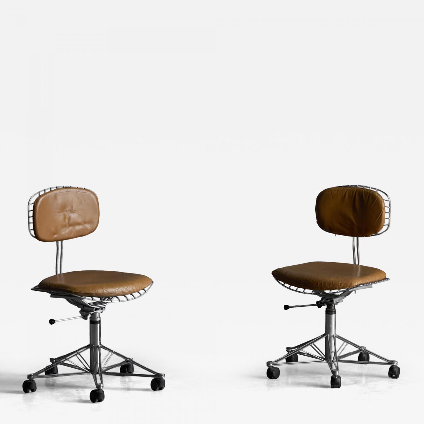 A scarce pair of architectural desk chairs designed by Michel Cadestin with Georges Laurent for the Beaubourg (Centre Pompidou) project. Conceived in 1976–77 for the Pompidou Library’s staff, the “Chaise Dactylo” sits on a star-base with casters and features the signature electro-galvanized steel wire trellis that cradles the seat and backrest. Original cognac leather cushions add warmth to the industrial frame, while the lever allows height adjustment for precise ergonomics. Produced by Teda, these early editions are sought after for their direct link to the Pompidou’s radical design language - functional, graphic, and unmistakably 1970s. Beyond their striking aesthetic, they represent a rare fusion of practicality and avant-garde architecture, echoing the Centre Pompidou’s revolutionary spirit. Today, they are considered highly collectible pieces of French design history.