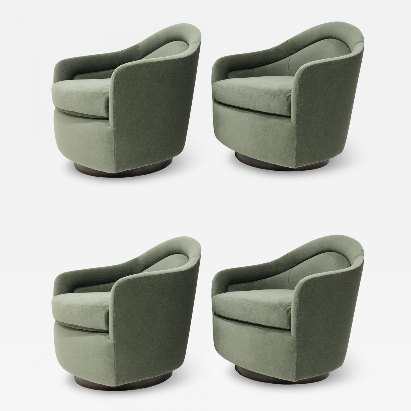 Super great looking set of four of Milo Baughman style lounge chairs newly upholstered in mohair by Vendome, color Eucalyptus. These are stationary; however, a swivel can be added. Base is walnut.