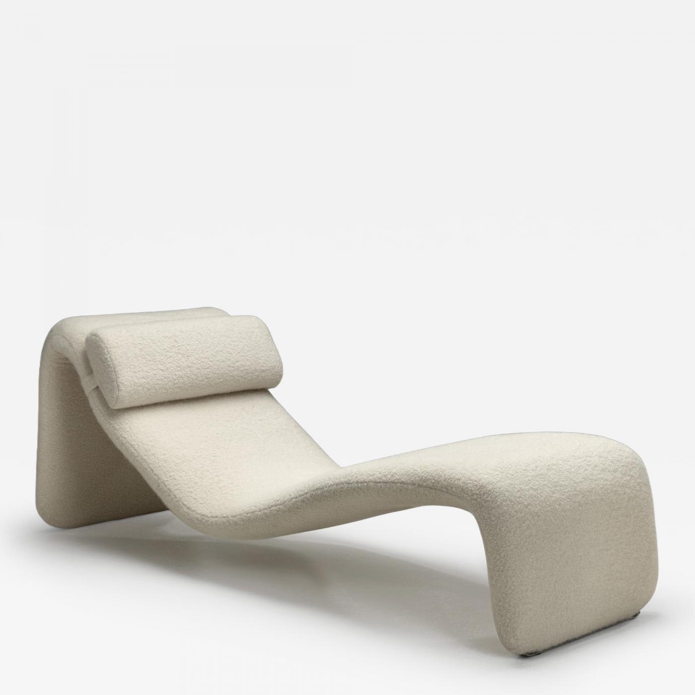 In 1965 he designed the ‘Djinn Series’, inspired by the figure of the ‘djinni’ (genie), a mystical creature of Arabian fairy tales capable of morphing into human or animal form. This fluid uncertainty is clearly visible in the elegant shape of the daybed, where curved edges and softly folded ends connect seamlessly with the low-slung seating. The carefully crafted ergonomic design moulds perfectly to a resting human figure. Without distinctive breaks and different components, the daybed suggests effortless comfort - its relaxed form inviting the person for moments of unhurried rest, aligning with the decade’s easing of societal mores. The strapped rectangular pillow at the headrest is a unique complement that adds visual interest and breaks the flat surface of the piece. This daybed has been reupholstered in a premium fabric, which guarantees outstanding comfort and softness. The light colour of the upholstery, covering every part of the daybed also contributes to its uniqueness, truly making it a statement piece in any interior.