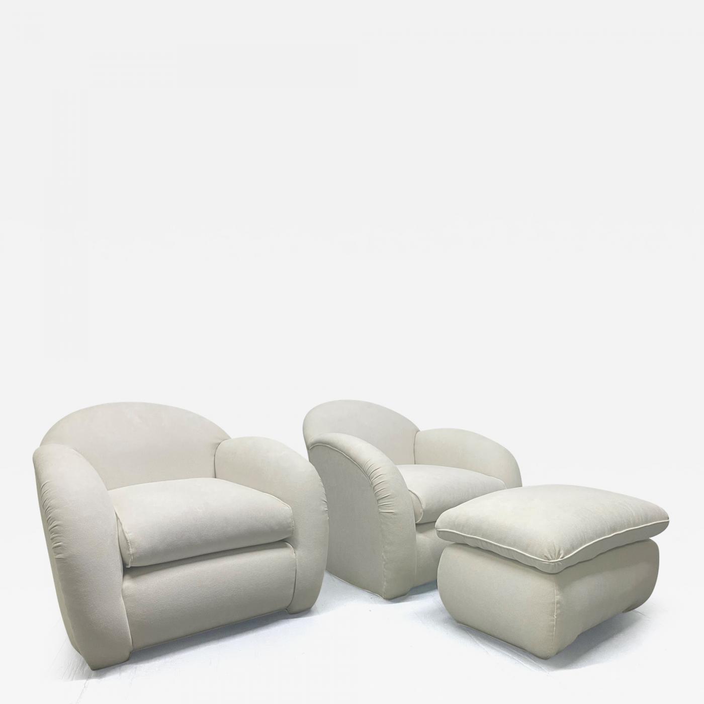 Pair of Art Deco Upholstered lounge chairs with a matching ottoman. Cloud chairs. Ottoman measures: 29W x 20D x 17.5H.